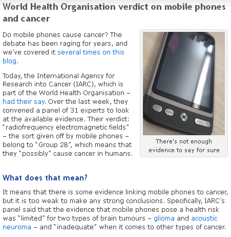 The Guardian have also taken this rather reactionary line, though with a less misleading title (Mobile phone use is a possible cancer risk, rather than Mobile phones may cause cancer - something subtle, but important). With a longer article, we can get a bit more background,