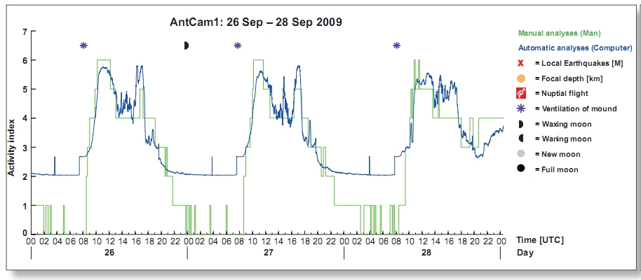 "For three years (2009–2012), two red wood ant mounds (Formica rufa-group), located at the seismically active Neuwied Basin (Eifel, Germany), have been monitored 24/7 by high-resolution cameras. Early results show that ants have a well-identifiable standard daily routine. Correlation with local seismic events suggests changes in the ants’ behavior hours before the earthquake: the nocturnal rest phase and daily activity are suppressed, and standard daily routine does not resume until the next day. At present, an automated image evaluation routine is being applied to the video streams. Based on this automated approach, a statistical analysis of the ant behavior will be carried out."Text source: Early Results of Three-Year Monitoring of Red Wood Ants’ Behavioral Changes and Their Possible Correlation with Earthquake Events