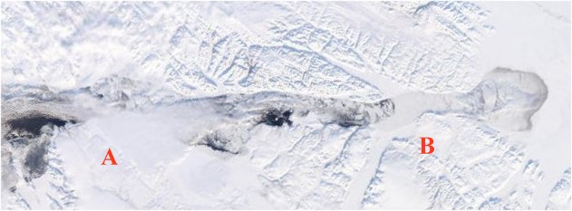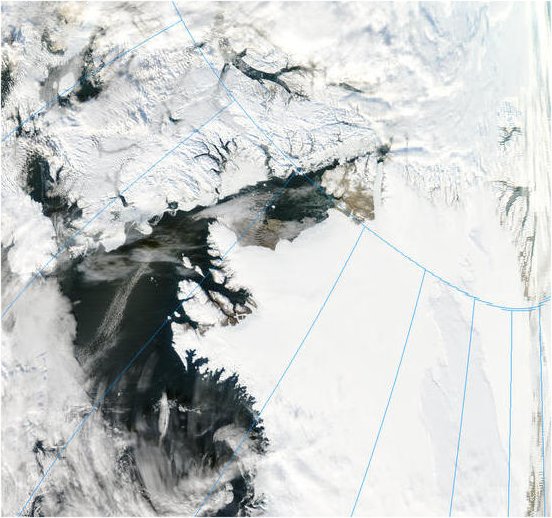 This series of images from MODIS/aqua and MODIS/terra show normal behaviour for 2006, and then the growing area of affected ice following the ice loss of 2007.