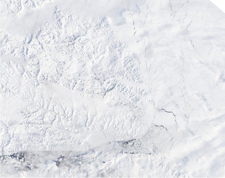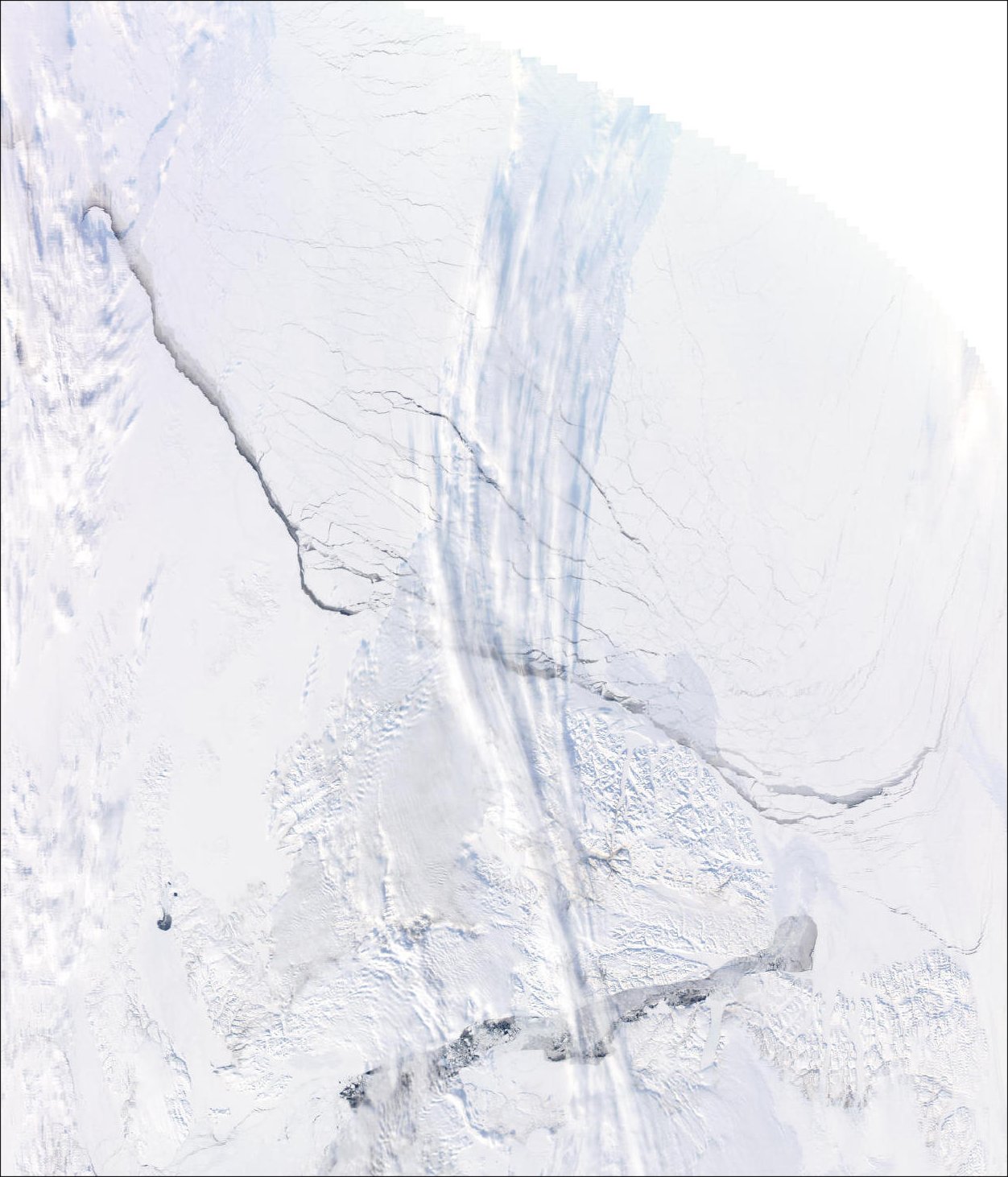 On the Lincoln Sea the broken ice appears as tracks along the Ellesmere Island coast.
