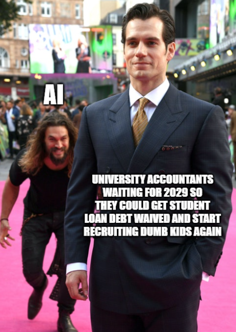 Academics were so gleefully protesting for students to have free money that they never saw AI was rushing up on their flank. Why pay quirky humans if AI can educated cheaper.