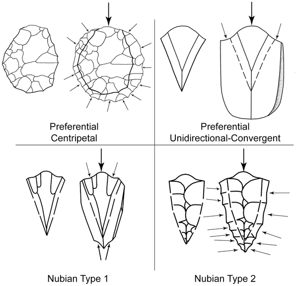 Schematic of preferential Levallois core preparation strategies mentioned in text.