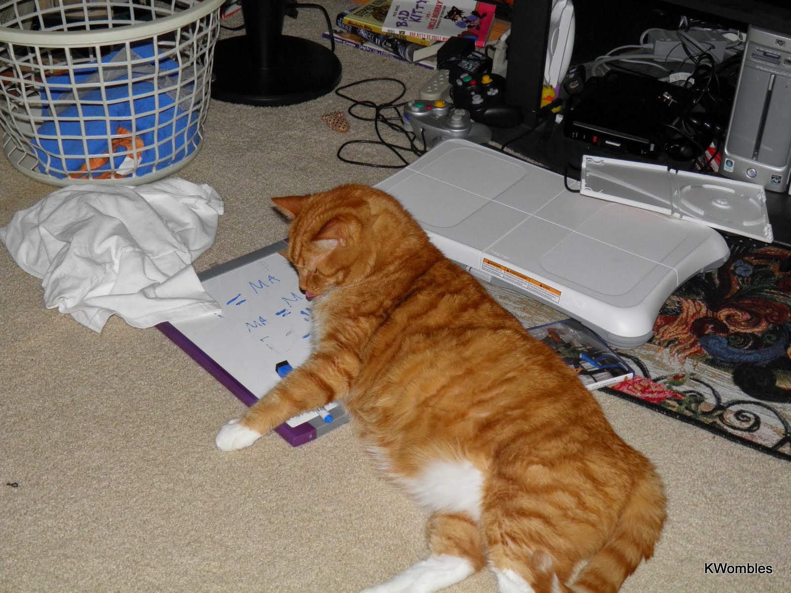 (ignore the mess, but somehow laundry, the Wii fit board, white boards and cats blend together)