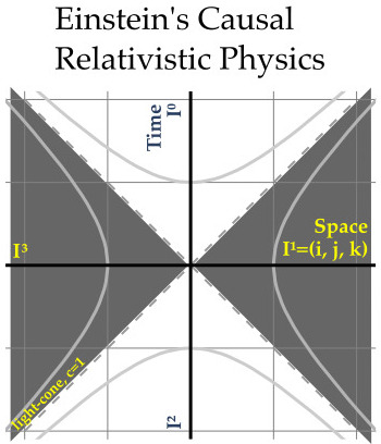 The study of EM required new types of physics. Einstein introduced relativistic physics where time can rotate into space. Einstein's math professor Minkowski created the space-time diagram. The path where light travels to and from the observer at here-now separates space-time into time-like and space-like regions.
