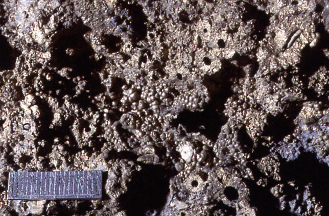 A view from above a chimney field, showing the chimneys (round black circles) and bubbles, which contain chambers. The object placed for scale is two centimeters across. These fossil chimneys were formed well after life's origin, but may be similar to those in which, according to one hypothesis, metabolism first began (by Richard Robinson in PLoS, Nov 2005, via Wikimedia Commons).