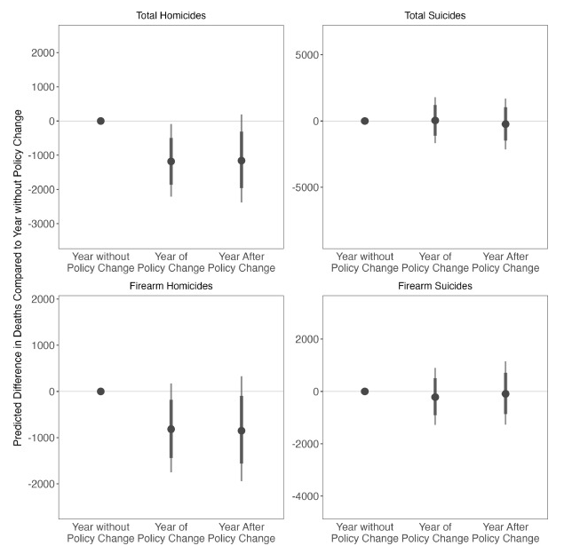 From the paper: Points represent predicted change in the number of deaths nationally in 2018 after a hypothetical shift in alcohol policy environment applied to all states. The magnitude of this shift is equivalent to moving from the 25th percentile (less restrictive) to 75th percentile (more restrictive) of APS scores in 2018. Thicker lines represent 80% Bayesian credible interval. Thinner lines represent 95% credible intervals. The light horizontal line represents no change in deaths after a policy change.