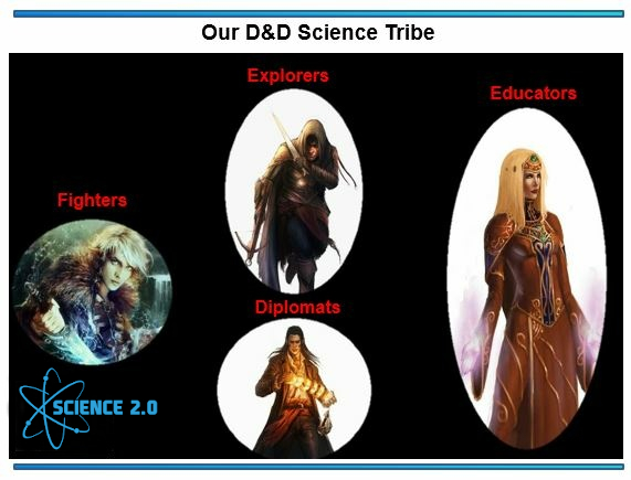 Anyway, if you don't know, D&D is a role-playing game invented in the 1970s - you pretend to be a character with other friends who are also characters in some mysterious or dangerous situation. Because it was based on long-standing fantasy archetypes, sword and sorcery like the worlds of R.E. Howard and Tolkein, the typical D&D group, the tribe, became a swordsman, a ranged weapon jack-of-all-trades, a magician scholar, and a clever thief or a mystic.(1) You can probably guess right away how those different types working together in science communication can be a great thing. If we can get people to do it.