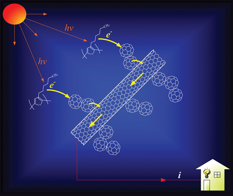Here’s how it works in very simplistic terms. Sunlight falls on the plastic sheet – which is not exactly any old plastic. It’s a fancy polymer made for solar applications. The sunlight excites the polymer so it produces electrons. The Buckyballs snatch up the electrons, hand them off to the nanotubes to transport them. The current then flows down wires connected to the solar cell and lights up your house. Or billboard. Or boat. Or whatever else you want it to power up.
