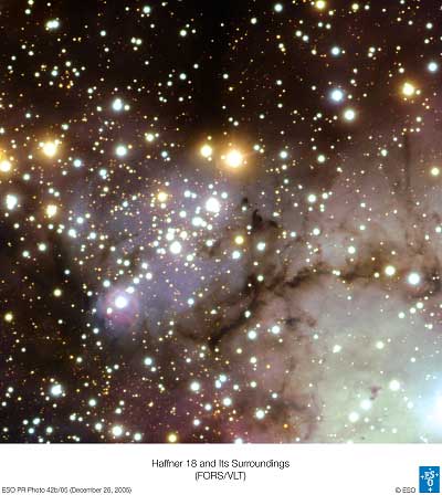 ESO PR Photo 42b/05 zooms in on the open stellar cluster Haffner 18, perfectly illustrating three different stages of this process of star formation: In the centre of the picture, Haffner 18, a group of mature stars that have already dispersed their birth nebulae, represents the completed product or immediate past of the star formation process. Located at the bottom left of this cluster, a very young star, just come into existence and, still surrounded by its birth cocoon of gas, provides insight into the very present of star birth. Finally, the dust clouds towards the right corner of the image are active stellar nurseries that will produce more new stars in the future.