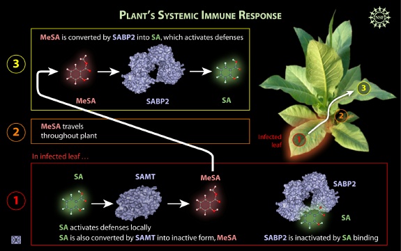 - MeSA arriving at distant, uninfected leaves is converted by the active form of SABP2 into disease-fighting SA, which turns on the plant's defenses.