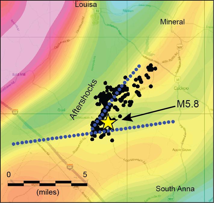 The situation near the fault on which the magnitude 5.8 Mineral earthquake occurred is more complex than that. For example, the fault may separate different types of rocks with varying densities and strengths, as suggested by the gravity data. This contributes to a complex stress field that could also be more conducive to slip.