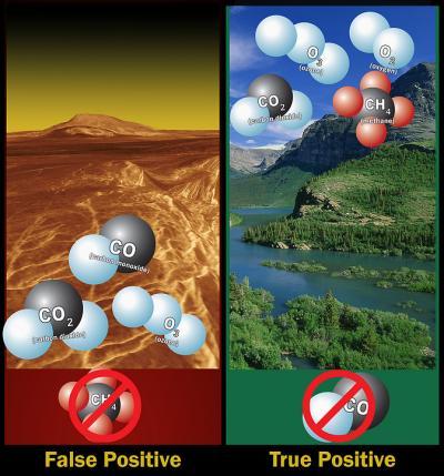 Left: Ozone molecules in a planet's atmosphere could indicate biological activity, but ozone, carbon dioxide and carbon monoxide -- without methane, is likely a false positive. Right: Ozone, oxygen, carbon dioxide and methane -- without carbon monoxide, indicate a possible true positive. Credit: NASA