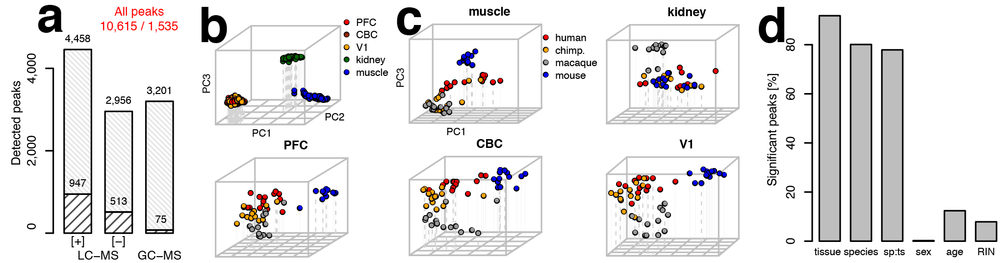Metabolome data quantification, annotation, and variation analysis. (a) The total number of metabolite peaks measured in our datasets. The bottom part of each bar indicates the number of peaks that were annotated in respective datasets. The total numbers of peaks and numbers of annotated peaks are indicated above the bars. (b) PCA plot based on normalized intensities of 10,615 peaks from all metabolic datasets measured in five tissues of the four species. Each circle represents an individual sample colored according to the tissue. (c) PCA plots for each of the five tissues: muscle, kidney, PFC, CBC and V1. Each circle represents an individual sample colored according to species. (d) Percentages of peaks with a significant proportion of variation (ANOVA, permutation p<0.01) explained by tissue, species, species–tissue interaction term (sp∶ts), sex, age, and sample RNA preservation. RIN, RNA Integrity Number. doi:10.1371/journal.pbio.1001871