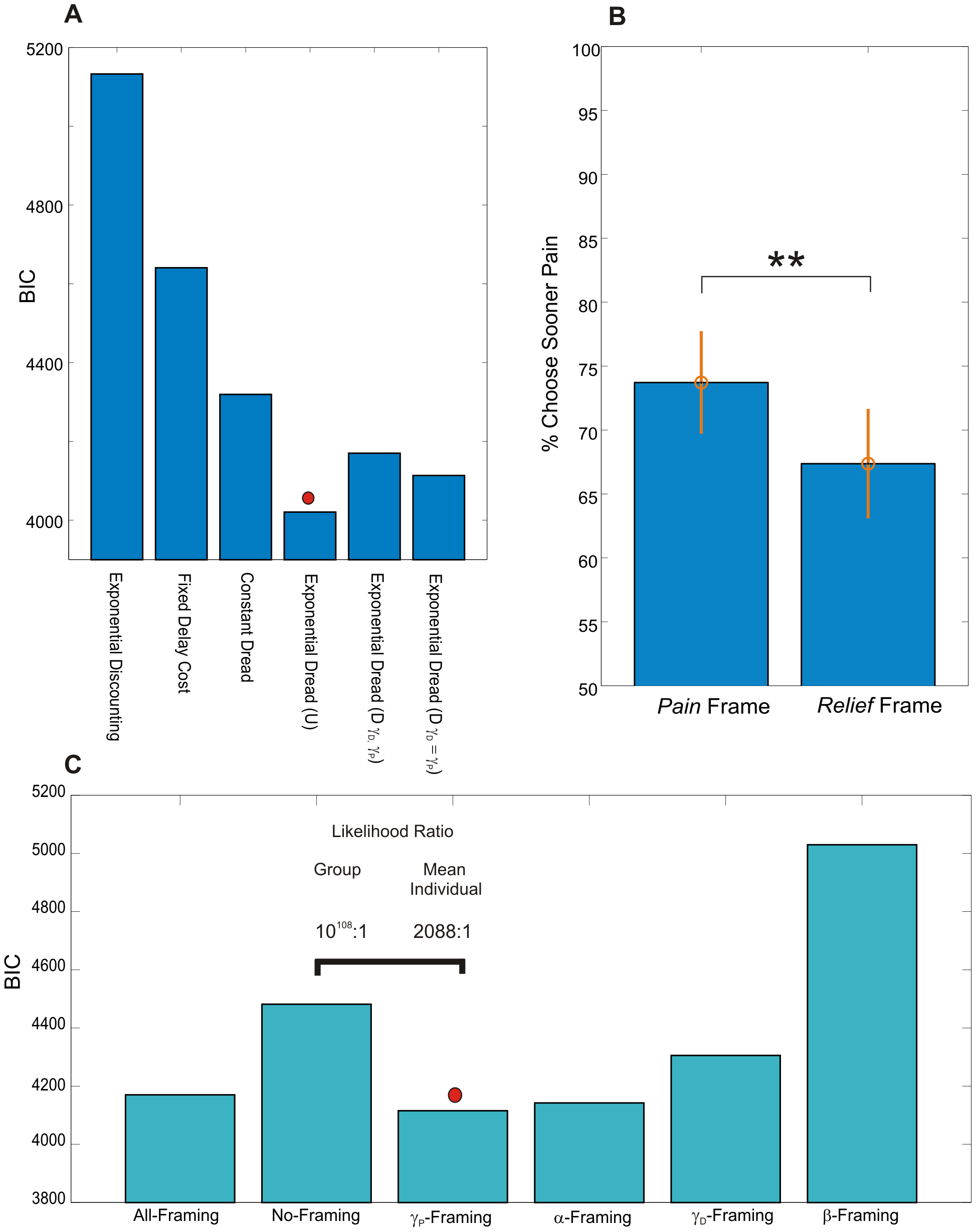 Model comparison and framing effects: Experiment 1. A: Bayesian Information Criterion (), summed across participants (N = 25) for the alternative models. Lower values of indicate better fits of the model. Exponential Dread outperformed other models, with Undiscounted Exponential Dread providing the most parsimonious fit at the group level, indicated by the red circle. B: Mean frequency of choosing sooner pain across all choices by all participants in either frame. Error bars show one standard error from the mean in each direction. Two-tailed paired t-test showed significant difference between the two frames t(32) = 2.84, p = 0.0077. This result was confirmed with non-parametric testing for differences between paired samples using the Wilcoxon Signed Rank test, which revealed significant differences between the two medians (N = 33, Z = −2.6, p = 0.0093). C: Results of fitting the general form Exponential Dread model to both pain and relief frames, whilst restricting which parameters were allowed to vary between frames. In the unrestricted framing model (All-Framing) all four parameters, the inverse softmax temperature, , the discount parameters, and , and the anticipation parameter, , were applied separately to each frame, yielding an eight parameter model. In the fully restricted framing model (No-Framing) all parameters were constrained to be equal across frames, yielding a four-parameter model. The best fit, indicated by the red circle, was provided by a four-parameter model in which , and were fixed across frames, leaving between-frame differences explained by differences in (-Framing). Likelihood ratios are displayed at both the group level and the individual level, strongly favoring the -Framing model over the No-Framing model at both the group (fixed effects) (LR = 10108∶1, χ2 = 497.3, p<0.001, d. f. = 25) and individual levels (Mean individual LR = 2088∶1, χ2 = 19.9, p<0.001, d. f. = 1) . Credit and link: