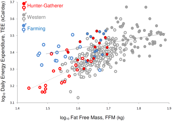 Individual comparisons of TEE and FFM. Energy expenditure for Hadza hunter-gatherers (red circles) was similar to that of Westerners (gray [19]–[26]). Bolivian women farmers (blue open circles [13], [31]) had higher TEE than either Hadza or Western women. Trendlines are ordinary least squares regressions through Western men (solid line) and Western women (dashed line).