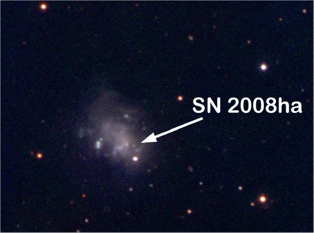 However, some core-collapse supernovae are up to 100 times less energetic and luminous than expected. These low-power explosions normally show the presence of hydrogen gas, but a new event, supernova SN 2008ha, in the galaxy UGC 12682, is the first dim supernova in which no hydrogen could be detected.