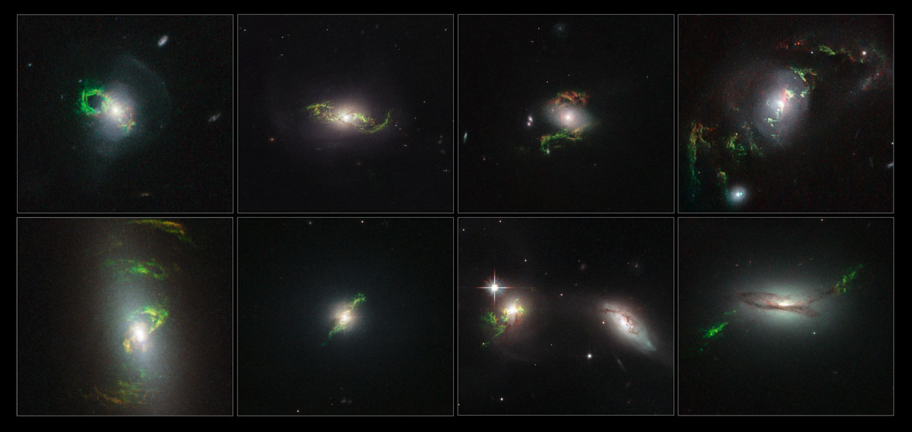 CLICK FOR LARGER SIZE. In each of these eight images a quasar beam has caused once-invisible filaments in deep space to glow through a process called photoionisation. Oxygen, helium, nitrogen, sulphur and neon in the filaments absorb light from the quasar and slowly re-emit it over many thousands of years. Their unmistakable emerald hue is caused by ionised oxygen, which glows green. The Hubble team found a total of twenty galaxies that had gas ionised by quasars; those featured here are (from left to right on top row) the Teacup (more formally known as 2MASX J14302986+1339117), NGC 5972, 2MASX J15100402+0740370 and UGC 7342, and (from left to right on bottom row) NGC 5252, Mrk 1498, UGC 11185 and 2MASX J22014163+1151237. Credit:NASA, ESA, Galaxy Zoo Team and W. Keel (University of Alabama, USA.