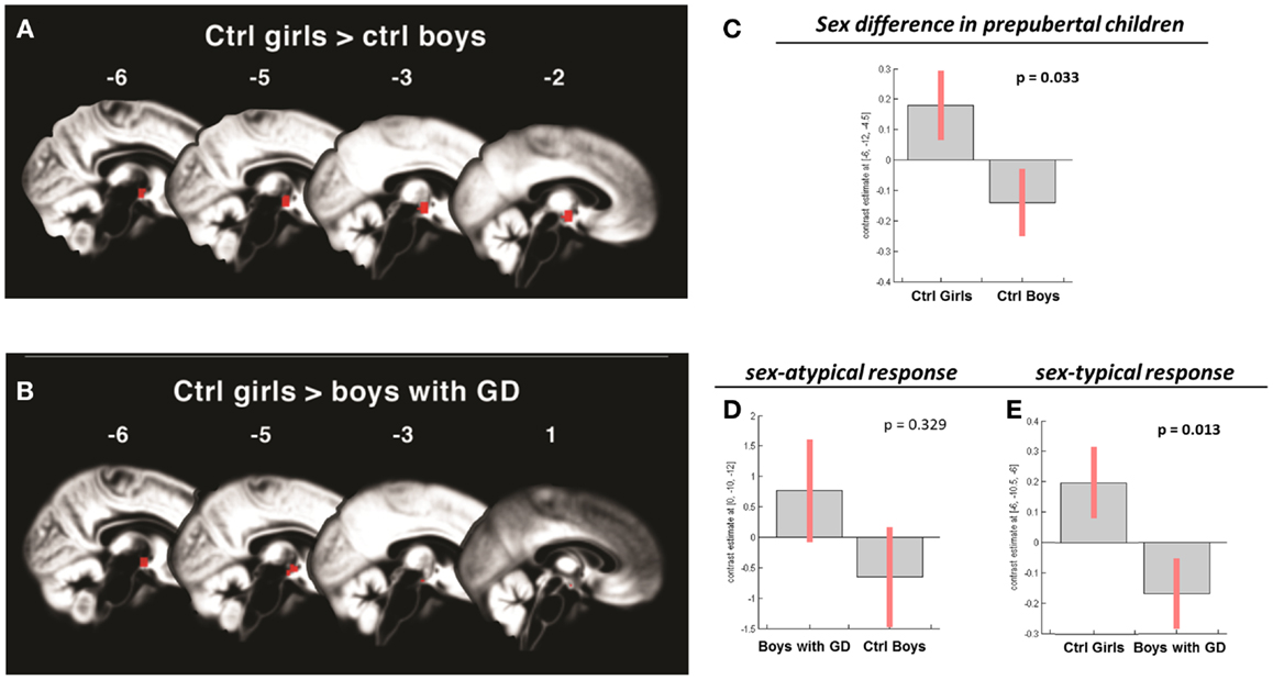 (A,B) Show the anatomic locations of the significant hypothalamic activations, indicated in red, in response to the chemo-signal androstadienone in the pre-pubertal age groups. The numbers above each sagittal plane represent the x-axis coordinates in Montreal Neurological Institute space. All voxels within the hypothalamic region of interest, surviving the statistical threshold of p < 0.05 (FWE-corrected) are shown. (C–E) Show the bar graphs of the corresponding group contrasts for the first-order time-modulation regressor, indicating group differences in sensitization to the steroid odor. (C) Displays the sex difference, i.e., between control girls and boys; (D) shows the non-significant sex-atypical (i.e., female-like) and (E) indicates the significant sex-typical (i.e., male-like) response of boys with gender dysphoria.