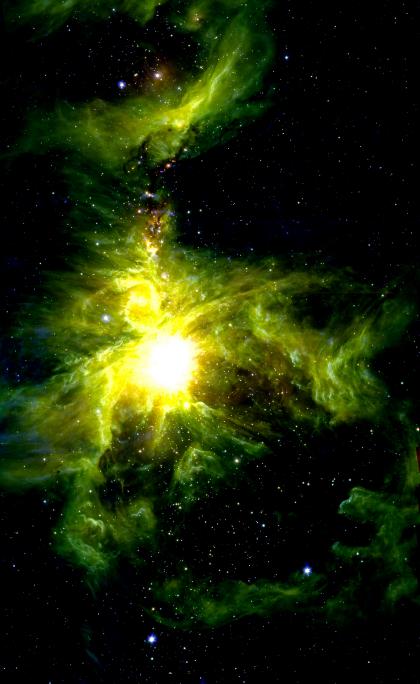 CLICK IMAGE FOR FULL SIZE. This spectacular image combines observations from the United Kingdom Infrared Telescope and the Spitzer Space Telescope. It shows just a small portion of the region surveyed. In this figure, parts of the Orion Molecular cloud are illuminated by nearby stars and therefore glow an eerie green color. The jets punch through the cloud and can be seen as a multitude of tiny pink-purple arcs, knots and filaments. The young stars that drive the jets are usually found along each jet and are colored golden orange. Credit: UKIRT / NASA / Spitzer Space Telescope