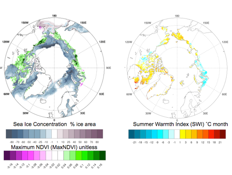 Magnitude trends for (left) spring sea-ice concentration (%) (as represented by trends from the climatological 50% sea-ice concentration level) and (left) annual MaxNDVI (unitless). The right panel shows land-surface summer warmth index (SWI) (˚C month). Trends were calculated using a least squares fit (regression) at each pixel. The SWI is the annual sum of the monthly mean temperatures > 0°C, derived from AVHRR thermal channels 3 (3.5–3.9 μm), 4 (10.3–11.3 μm) and 5 (11.5–12.5 μm). The total trend magnitude (regression times 30 years) over the 1982–2011 period is presented. Figure courtesy of U. Bhatt, Geophysical Institute, UAF.
