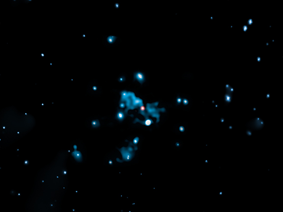 X-ray data from Chandra, radio emission from MERLIN, and optical data from SDSS show a small region of the Chandra Deep Field North, one of the deepest X-ray images ever obtained. The diffuse blue object near the center is thought to be a cosmic "ghost" generated by a huge eruption from a supermassive black hole in a distant galaxy. This X-ray ghost remains long after radio waves from the source have died off, giving astronomers an opportunity to study this phenomenon in the early Universe. Credit: X-ray (NASA/CXC/IoA/A.Fabian et al.); Optical (SDSS), Radio (STFC/JBO/MERLIN)