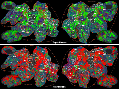 The brain scans simultaneously measured neural activity via blood flow in thousands of locations across the brain. Researchers used regularized linear regression analysis, which finds correlations in data, to build models showing how each of the roughly 50,000 locations near the cortex responded to each of the 935 categories of objects and actions seen in the movie clips. Next, they compared how much of the cortex was devoted to detecting humans or vehicles depending on whether or not each of those categories was the search target.
