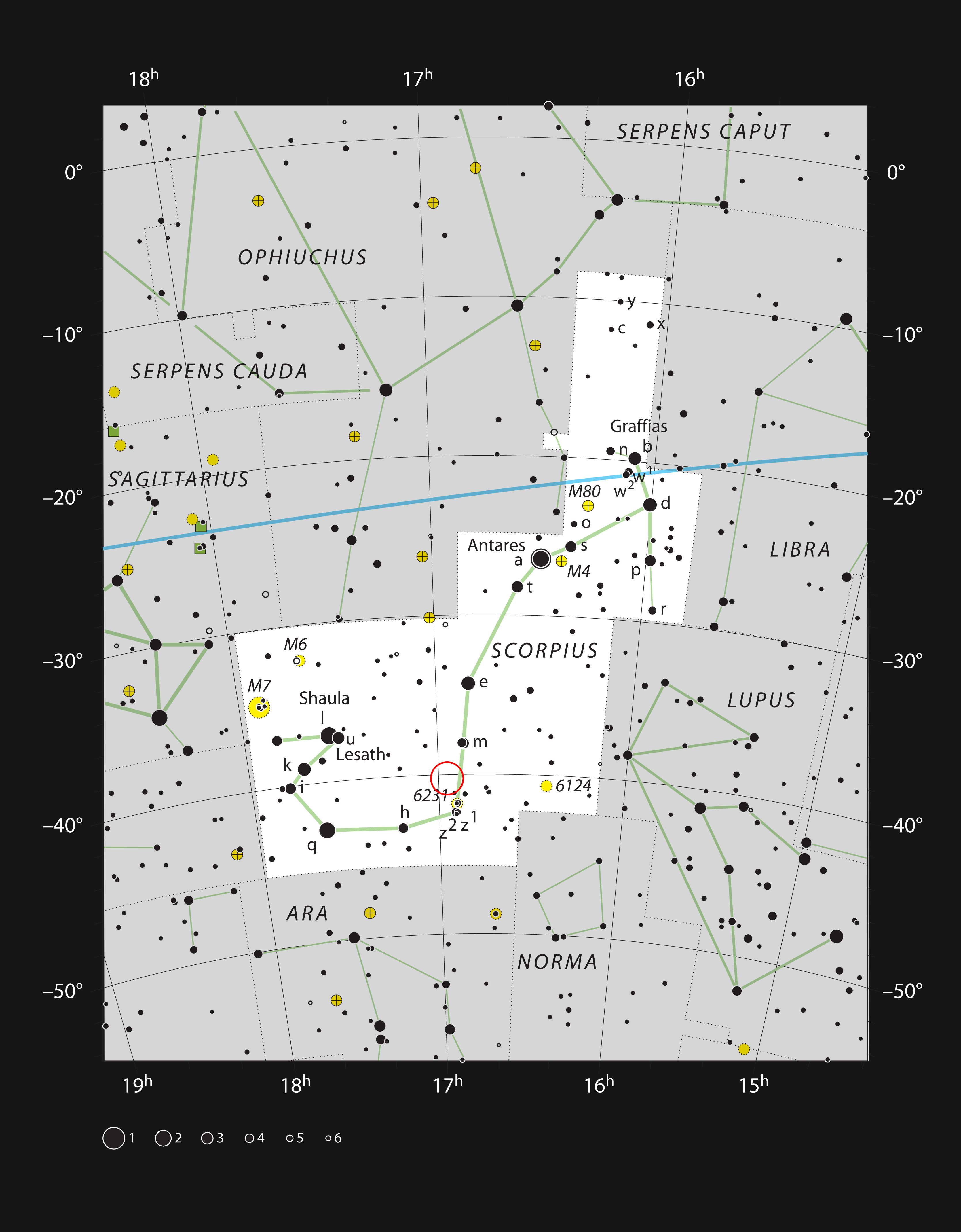 Scorpius. The location of the star formation region called the Prawn Nebula (IC 4628) is indicated with a red circle. This cloud appears large but is very faint and cannot be seen visually with a small telescope. Credit: ESO, IAU and Sky and Telescope