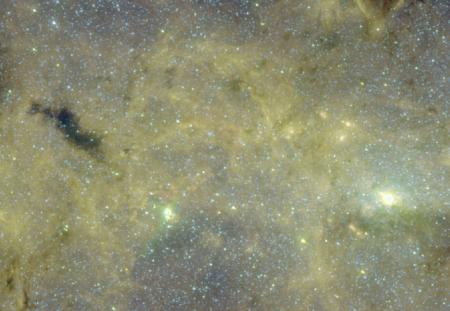 This image, taken with NASA's Spitzer infrared space telescope, shows the mysterious galactic cloud, seen as the black object on the left. The galactic center is the bright spot on the right. Credit: NASA/Spitzer/Benjamin et al., Churchwell et al.