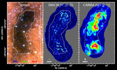 This is the Spitzer image of the cloud (left). The SMA image (center) shows the relative lack of dense cores of gas that are thought to form stars. The CARMA image (right) shows the presence of silicon monoxide, which suggests the cloud might be the result of two colliding clouds. Credit: Caltech/Kauffmann, Pillai, and Zhang