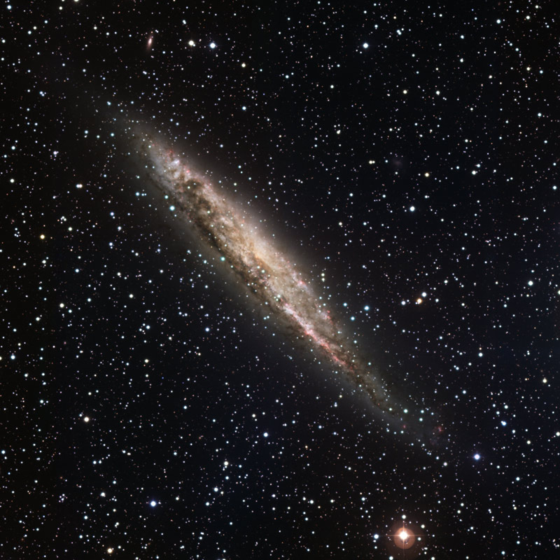 Today’s new portrait of NGC 4945 comes courtesy of the Wide Field Imager (WFI) instrument at the 2.2-metre MPG/ESO telescope at the La Silla Observatory in Chile. NGC 4945 appears cigar-shaped from our perspective on Earth, but the galaxy is actually a disc many times wider than it is thick, with bands of stars and glowing gas spiralling around its centre. With the use of special optical filters to isolate the colour of light emitted by heated gases such as hydrogen, the image displays sharp contrasts in NGC 4945 that indicate areas of star formation.