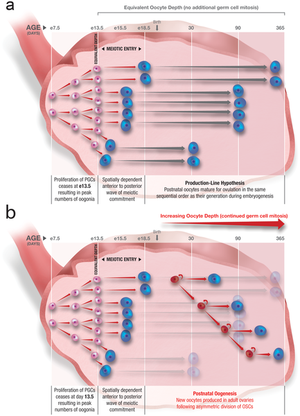 Postnatal oogenesis through ongoing oogonial stem cell (OSC) mitosis explains increasing oocyte depth with age. (a) Following primordial germ cell (PGC) expansion starting at embryonic day 7.5 (e7.5) in the mouse, proliferation of female germ cells (oogonia; pink) ceases at e13.5 concomitant with a 5-day period of germ cell meiotic commitment that drives formation of oocytes (blue); since all oocytes produced during this time are of equivalent “depth”, the production-line hypothesis of postnatal oocyte maturation cannot logically explain increasing oocyte depth as females age. (b) If continued proliferation of OSCs (red) and their subsequent differentiation into oocytes (blue) during postnatal life is superimposed on the production-line hypothesis, the emerging picture is consistent with a progressive increase in oocyte depth in females as they age. Credit: doi:10.1371/journal.pgen.1002848.g001