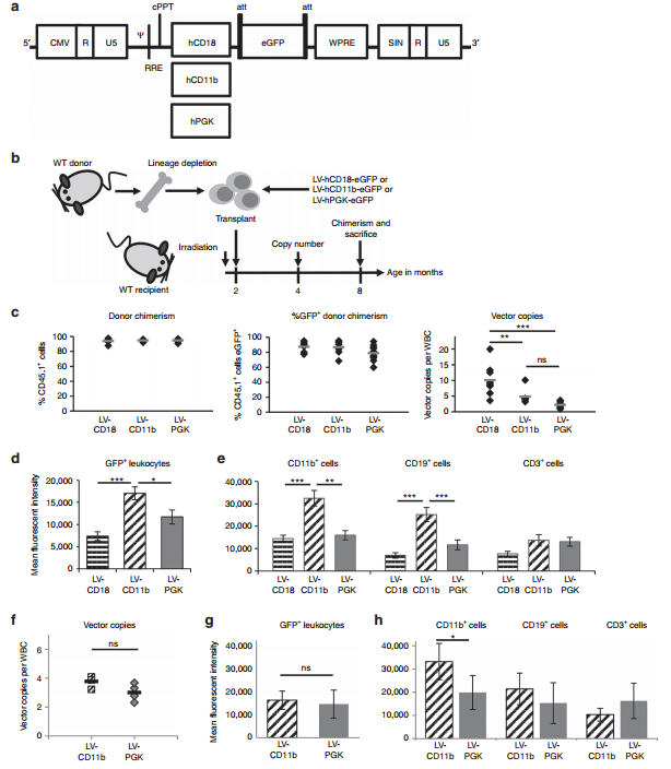 Comparison of eGFP expression from myeloid promoters. (a) pCCL LVs containing human CD18, CD11b, and PGK promoters driving eGFP expression. (b) WT bone marrow was lineage depleted and the enriched stem cell population transduced with LV-hCD18-eGFP, LV-hCD11beGFP, or LV-hPGK-eGFP at an MOI of 40–70 and transplanted into myeloablated WT mice. n= 8–10 (c) Donor and eGFP chimerism was determined 24 weeks post-transplantation. The vector copy number (VCN) was determined in WBCs. (d–e) Mean fluorescent intensity of eGFP expression was determined for all leukocytes and for CD11b, CD19, and CD3 cells 24 weeks post-transplantation. (f–h) Mice with most equivalent copy numbers (VCN of 2.3–4.1) in WBCs were further compared. Error bars represent the SEM. Significant differences between the two groups marked with a line are demonstrated with *P< 0.05; **P< 0.01; and ***P< 0.001. CMV, cytomegalovirus; eGFP, enhanced green fluorescent protein; hPGK, human phosphoglycerate kinase; LV, lentiviral vector; MOI, multiplicity of infection; ns, nonsignificant; WBC, white blood cell; WT, wild-type. Credit and link: