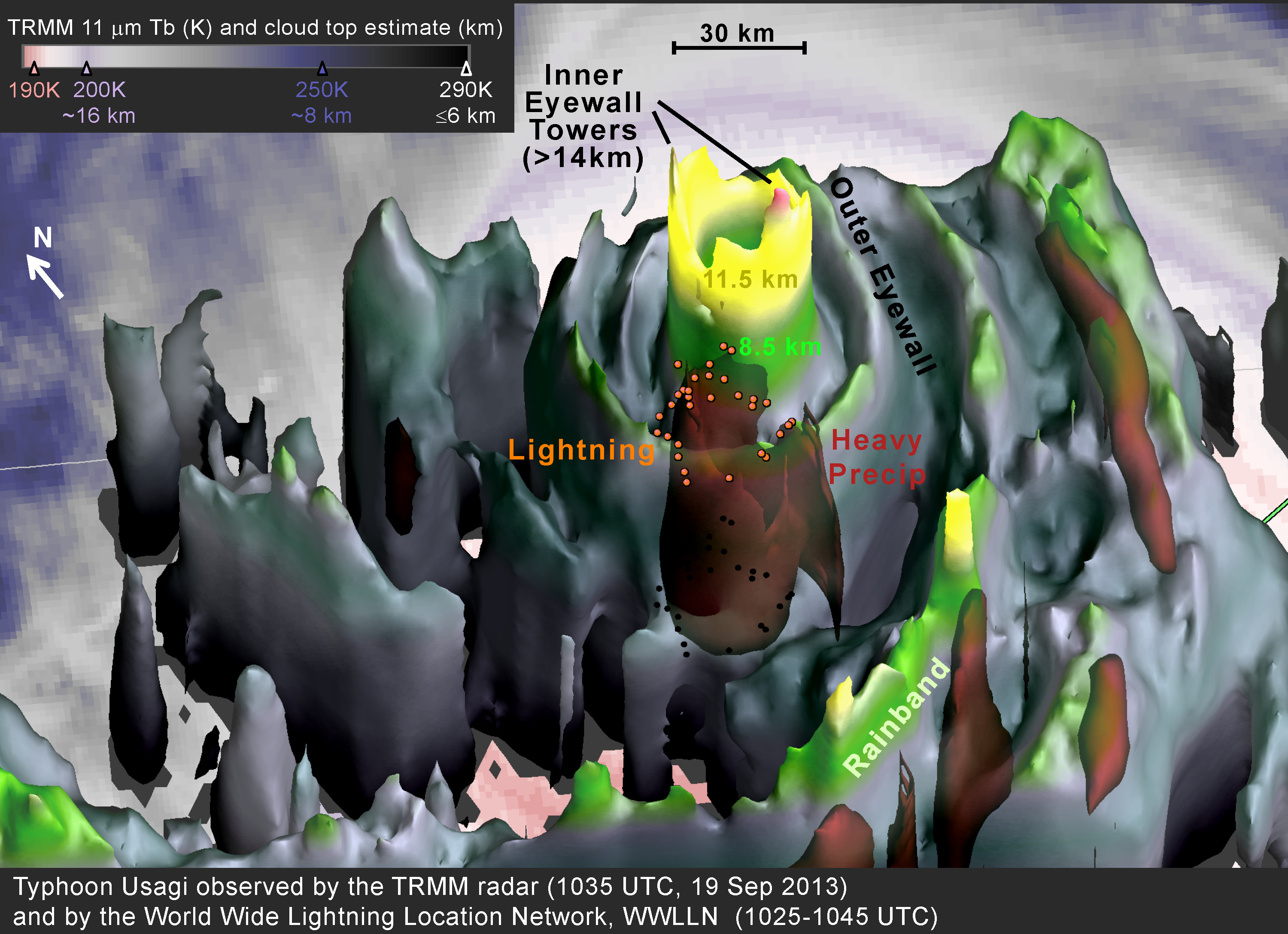 This TRMM 3-D image of Super-Typhoon Usagi on Sept. 19 shows heavy rain (red) at the base of the eyewall. The lightning flashes (ring of small orange dots) are displayed at 5 km altitude. That's near the freezing level in tropical cyclones and near the top of the heavy precipitation.