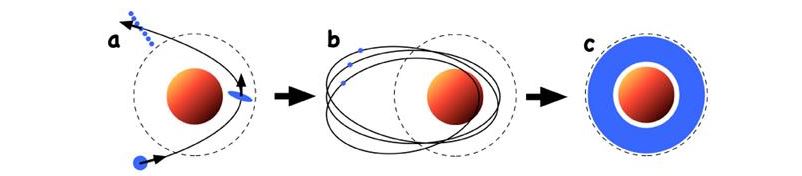 Schematic illustration of the ring formation process. The dotted lines show the distance at which the giant planets’ gravity is strong enough that tidal disruption occurs. (a) When Kuiper belt objects have close encounters with giant planets, they are destroyed by the giant planets’ tidal forces. (b) As a result of tidal disruption some fragments are captured into orbits around the planet. (c) Repeated collisions between the fragments cause the captured fragments to break down, their orbit becomes gradually more circular, and the current rings are formed (partial alteration of figure from Hyodo, Charnoz, Ohtsuki, Genda 2016, Icarus).