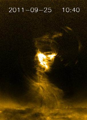 The Atmospheric Imaging Assembly saw superheated gases as hot as 50,000–2,000,000 Kelvin sucked from the root of a dense structure called the prominence, and spiral up into the high atmosphere and travel about 200,000 kilometers along helical paths for a period of at least three hours. The tornadoes were observed on September 25th, 2011. The hot gases in the tornadoes have speeds as high as 300,000 km per hour. Gas speeds of terrestrial tornadoes only reach a comparatively mild 150 km per hour.
