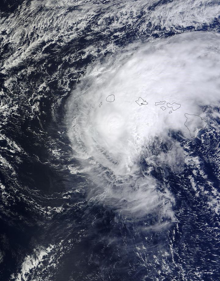 The Moderate Resolution Imaging Spectroradiometer aboard NASA's Terra satellite captured a visible picture of Tropical Storm Ana blanketing the Hawaiian Islands on Oct. 19 at 21:45 UTC (5:45 p.m. EDT). At the time, the strongest thunderstorms appeared to be in the eastern and western quadrants of the storm.