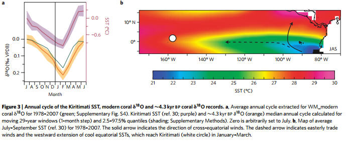 Citation: H. V. McGregor, M. J. Fischer, M. K. Gagan, D. Fink, S. J. Phipps, H. Wong & C. D. Woodroffe, 'A weak El Niño/Southern Oscillation with delayed seasonal growth around 4,300 years ago', Nature Geoscience 5 September 2013 doi:10.1038/ngeo1936