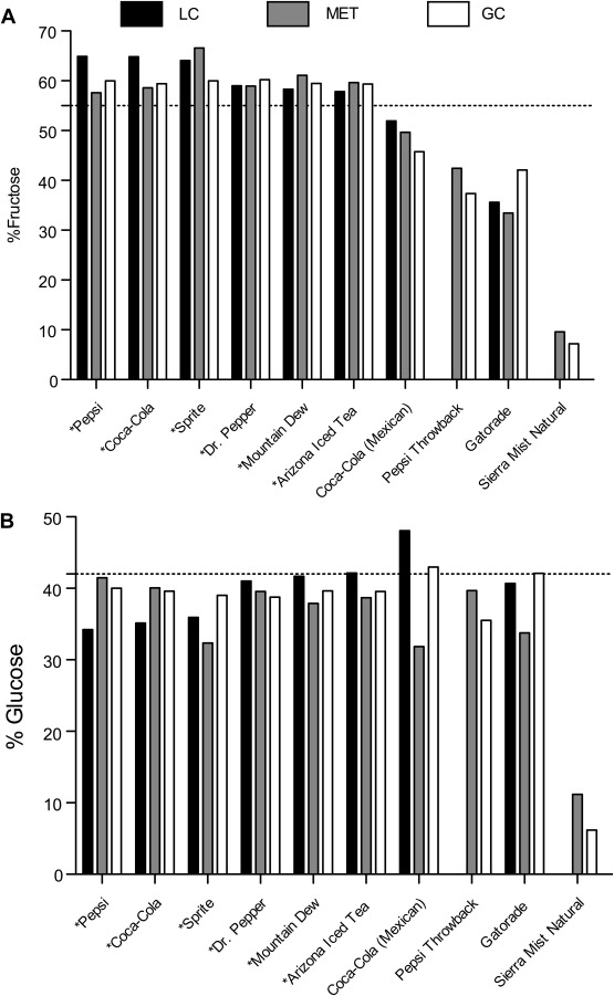 Mean sugar comparison of sodas across three independent methods. Panel A displays percent of total sugar shown to be free fructose in soda/sports drink products. The dashed line represents 55% fructose expected of HFCS-55. Panel B displays percent of total sugar shown to be free glucose in soda/sports drink products. The dashed line represents 42% glucose expected of HFCS-55. Bars represent methodology used to determine sugar profiles: LC=liquid chromatography, MET=metabolomics and GC=gas chromatography. Credit: 10.1016/j.nut.2014.04.003