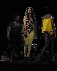 The colorful garment debuted on the runway at the Cornell Fashion Collective spring fashion show April 28 on the Cornell campus. It consists of an underlying one-piece body suit, hand-dyed in vibrant hues of purple, gold and blue, and a mesh hood and cape containing the repellant. The outfit is one of six in Ceesay's collection, which she said "explores and modernizes traditional African silhouettes and textiles by embracing the strength and sexuality of the modern woman."