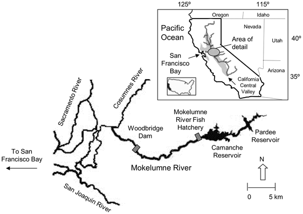The Mokelumne River and Mokelumne River Fish Hatchery in relation to the western United States, and the Sacramento-San Joaquin river system (shaded region) in California's Central Valley (insert). The in-river spawning habitat on the Mokelumne River consists of the area between its confluence with the Cosumnes River and upstream to the Camanche Dam (~16 km).