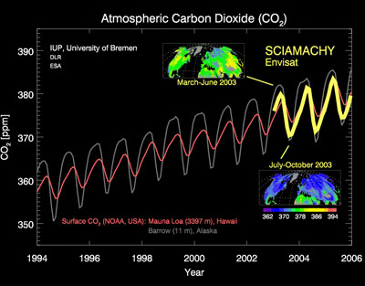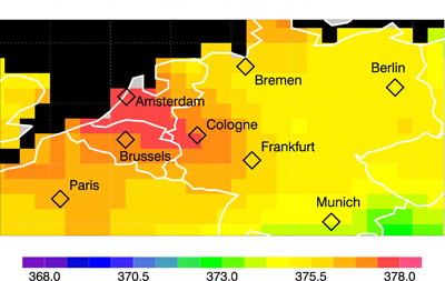 Dr Michael Buchwitz from the Institute of Environmental Physics (IUP) at the University of Bremen in Germany and his colleagues detected the relatively weak atmospheric CO2 signal arising from regional ‘anthropogenic’, or manmade, CO2 emissions over Europe by processing and analysing SCIAMACHY data from 2003 to 2005.