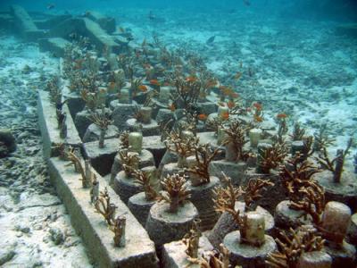 For example, Dodent Mahyiddin, a dive operator on Weh Island, leads an effort to transplant corals onto hand-laid underwater structures to restore a badly damaged reef in front of the remains of his dive shop, which was also destroyed by the tsunami. Already he is seeing widespread colonization of young corals.