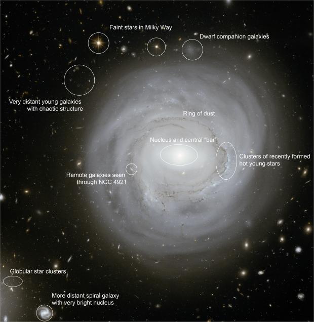 The long exposure times and sharp vision of Hubble not only allowed it to image NGC 4921 in exquisite detail, it also permitted it to see far beyond into the distant Universe. All around, and even through the galaxy itself, thousands of remote galaxies of all shapes, sizes and colours are visible. Many have the spotty and ragged appearance of galaxies at a time before the familiar division into spirals and ellipticals became established.