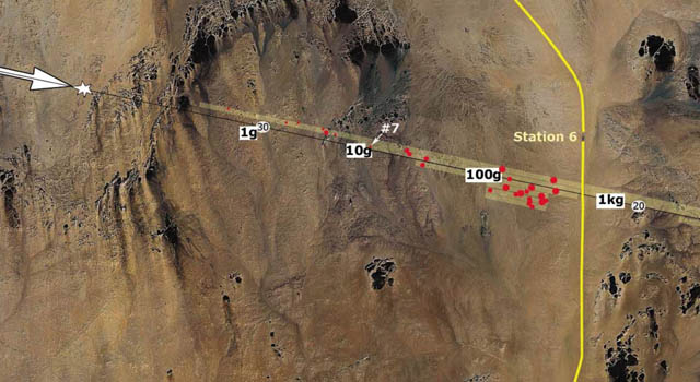 The location and subsequent recovery was like searching for a needle in a haystack. Scientists used what they referred to as a treasure map to locate the meteorites. NASA's Jet Propulsion Laboratory, or JPL, in Pasadena, Calif., produced a chart that gave the recovery team its search grid and specific target area.