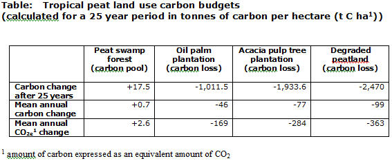 Natural peat swamp forest acts as a carbon sink accumulating at least 2.6 t ha-1 CO2e yr-1 as a consequence of tree growth and peat accumulation. Peatland under plantation agriculture and degraded peatland are both major carbon sources with oil palm and pulpwood plantations emitting CO2 e in the order of 170 and 280 t ha-1 yr-1, respectively, equivalent to 1,000 and 1,900 t ha-1 yr-1 over the 25 year life cycle.