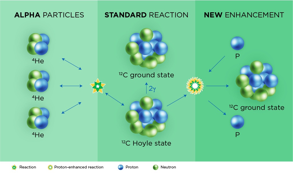In the triple-alpha process, stars fuse three helium nuclei, alpha particles together to create a single carbon atom with a surplus of energy - a Hoyle state. That Hoyle state can split back into three alpha particles or relax to the ground state of stable carbon by releasing a couple gamma rays (center). Inside supernovae, however, the creation of stable carbon can be enhanced with the help of extra protons (right). Credit: Facility for Rare Isotope Beams