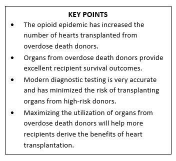 In a recent paper, Nader Moazami, MD, of NYU Langone Medical Center in New York and colleagues evaluated trends in organ donation and transplants among drug overdose deaths using data from the Scientific Registry of Transplant Recipients for the years 2000 to 2017. Of the 15,904 isolated heart transplants from adult donors during this period, opioid overdoses (10.8 percent) were the fourth most common cause of death, behind blunt injury (30.5 percent), hemorrhage/stroke (22.1 percent), and gunshot wound (18.3 percent). In 2017, overdoses accounted for more than 20 percent of donor deaths in 11 states; whereas in 2000, the highest state's rate was 5.6 percent and 33 states had less than 1 percent of donor deaths attributed to overdoses. The researchers also identified a significant increase in the percentage of transplants that utilized ODD hearts: 1.1 percent in 2000; 6 percent in 2012; and 14.2 percent in 2017. The current rate of ODD utilized for heart transplantation is 16.9 percent--a 14-fold increase from 2000.