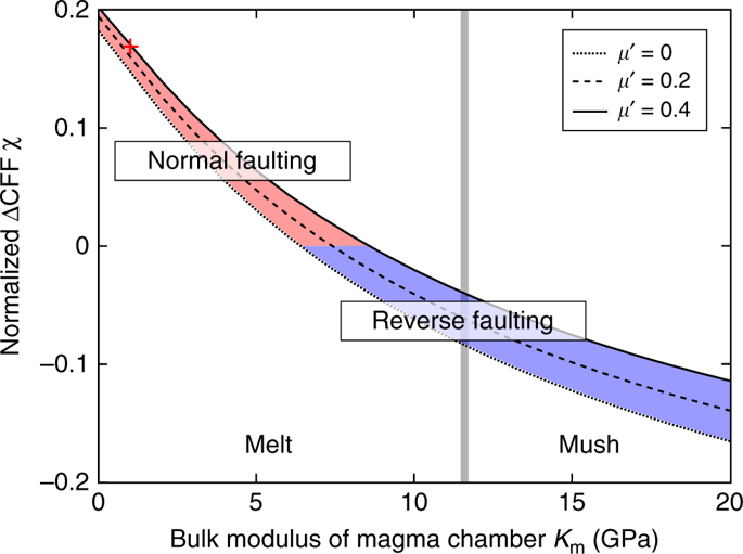 Properties of the magma chamber deformation system. The vertical axis χ is the average ΔCFS on a 67° dipping normal fault from the tip of the magma chamber to the surface (bold line in Fig. 3b) resulting from an applied vertical tidal stress, normalized by that stress. The red area defines the conditions in which low tides encourage seismicity on normal faults and high tides discourage it, and the blue area vice versa. The plus sign indicates the conditions shown in Fig. 3b
