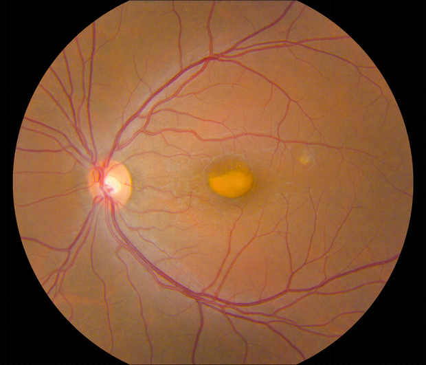 Retina with egg-yolk-like lesion in a person with vitelliform macular dystrophy. Credit: Johnny Tam, National Eye Institute. License CC BY-NC