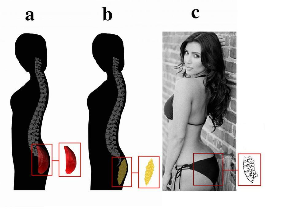 (A) "Basic" curvature gluteal development. Commonly identified by ordering Pumpkin Spice Lattes at Starbucks while wearing a North Face parka with Lululemon yoga pants. (B) "Ratchet" curvature, noted by presence of adipose tissue deposition, identified by using language such as "cultural feminine signifier" and "late capitalist patriarchy." (C) Ideal vertebral wedging curvature. (a) and (b) credit: The University of Texas at Austin . (c) credit: 2005